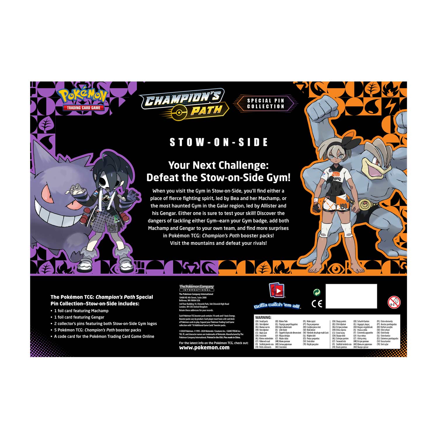 When you visit the Gym in Stow-on-Side, you'll find either a place of fierce fighting spirit, led by Bea and her Machamp, or the most haunted Gym in the Galar region, led by Allister and his Gengar. Either one is sure to test your skill! Discover the dangers of tackling either Gym—earn your Gym badge, add both Machamp and Gengar to your own team, and find more surprises in Pokémon TCG: Champion's Path booster packs! Visit the mountains and defeat your rivals!